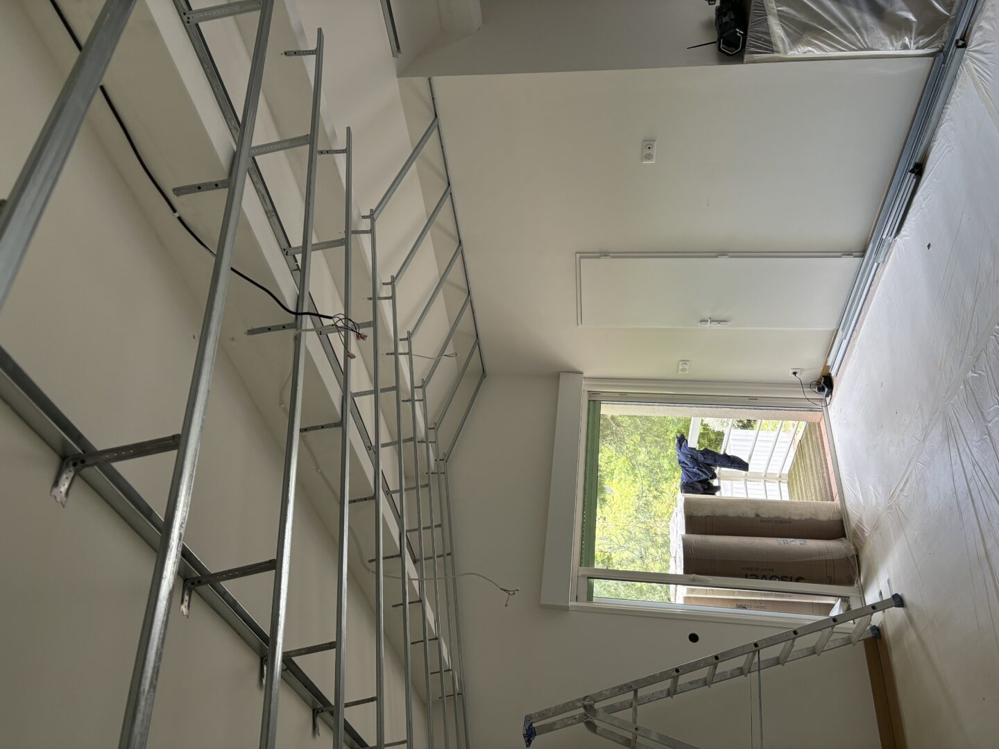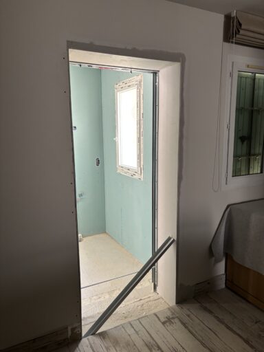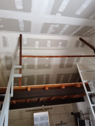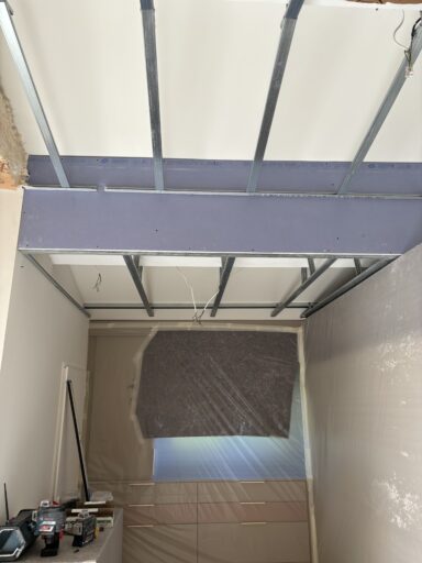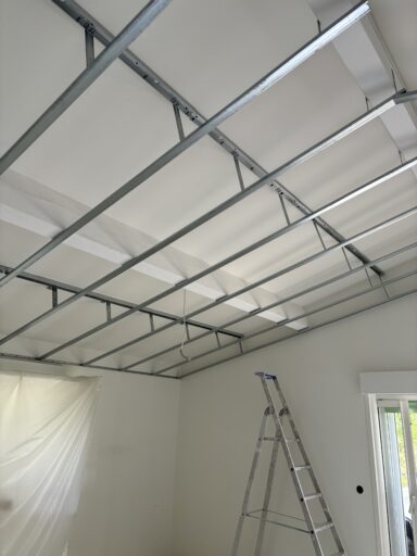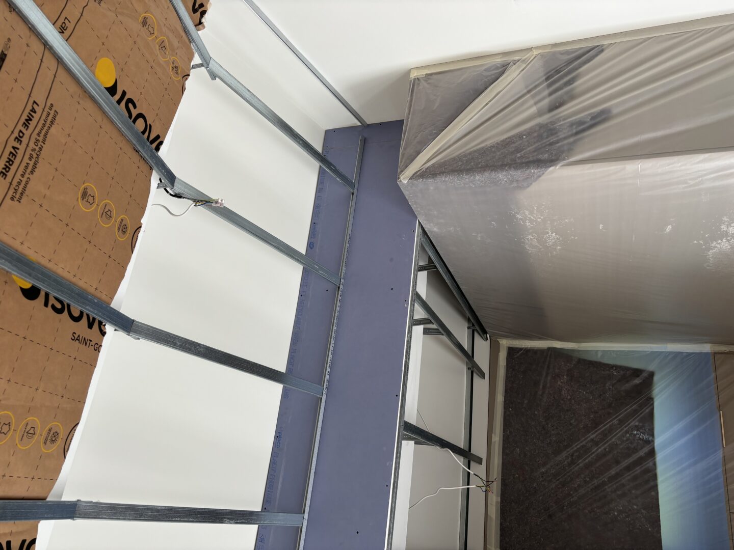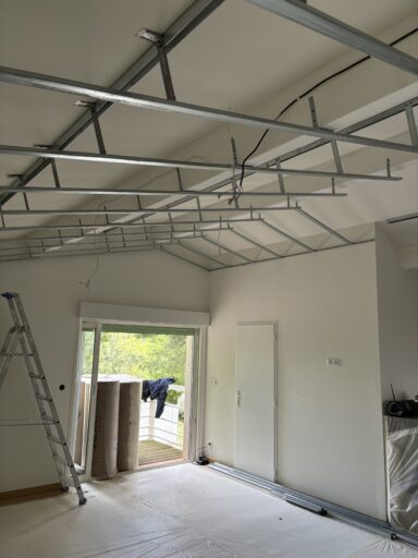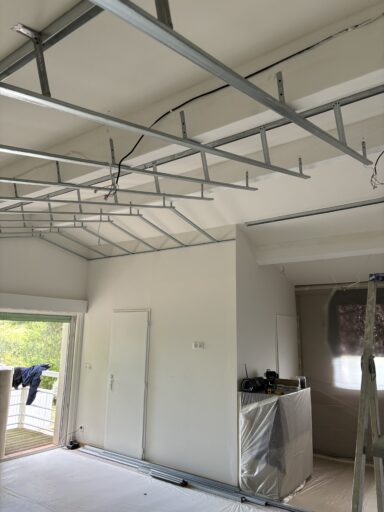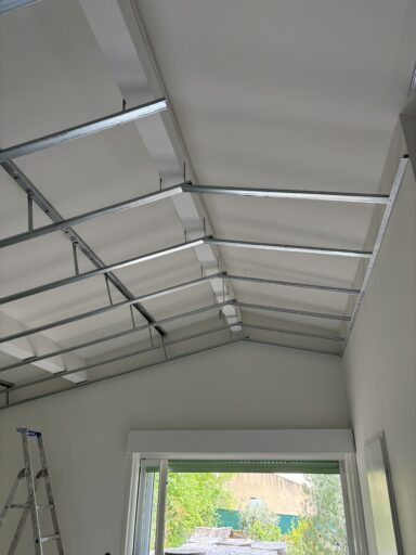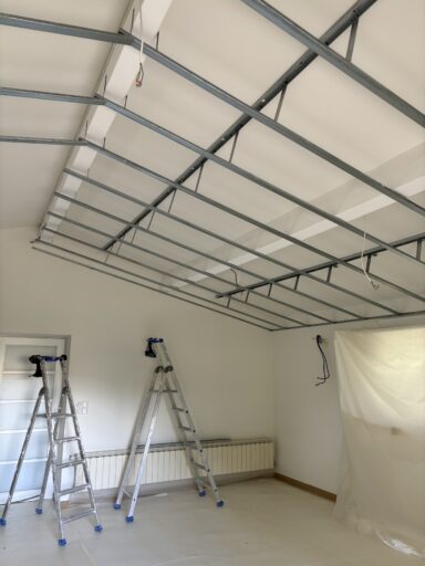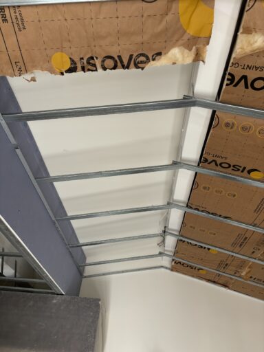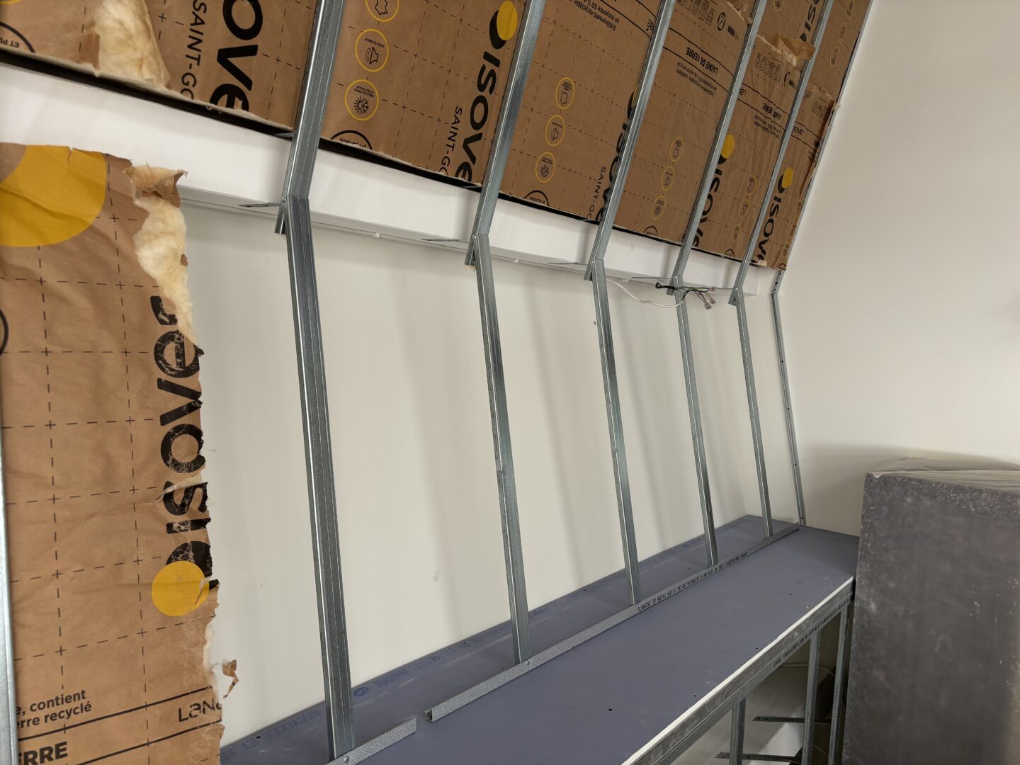 Après avoir combler d’éventuels trous et fissures des murs avec de la mousse expansive, une ossature métallique est créée sur-mesure et installée pour recevoir les plaques de plâtre. Les espaces entre les murs et les rails peuvent ensuite être remplis avec un isolant.
