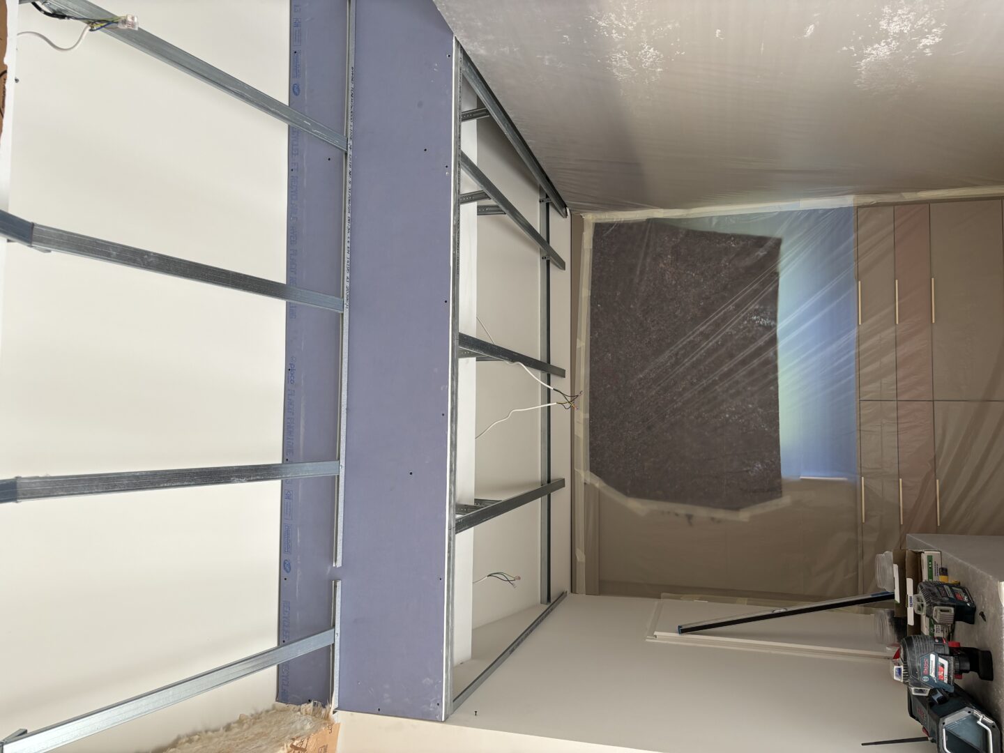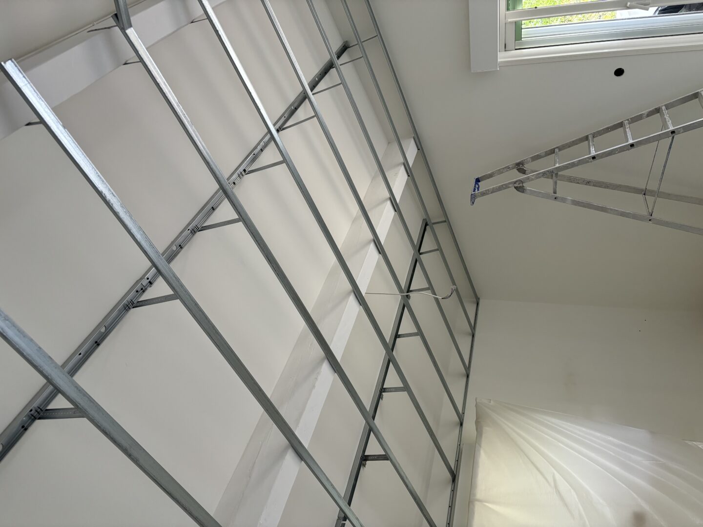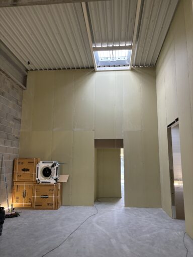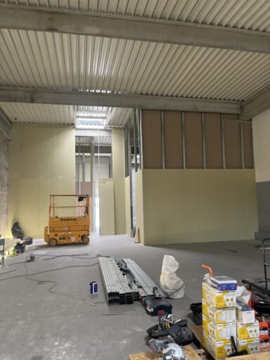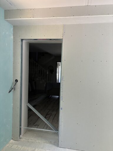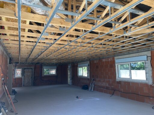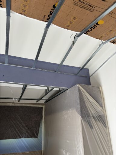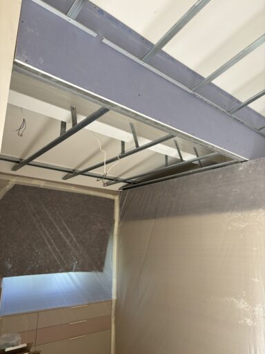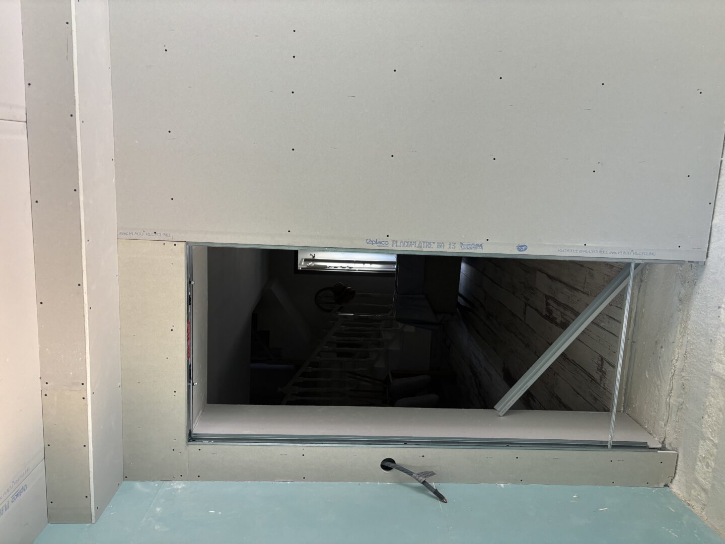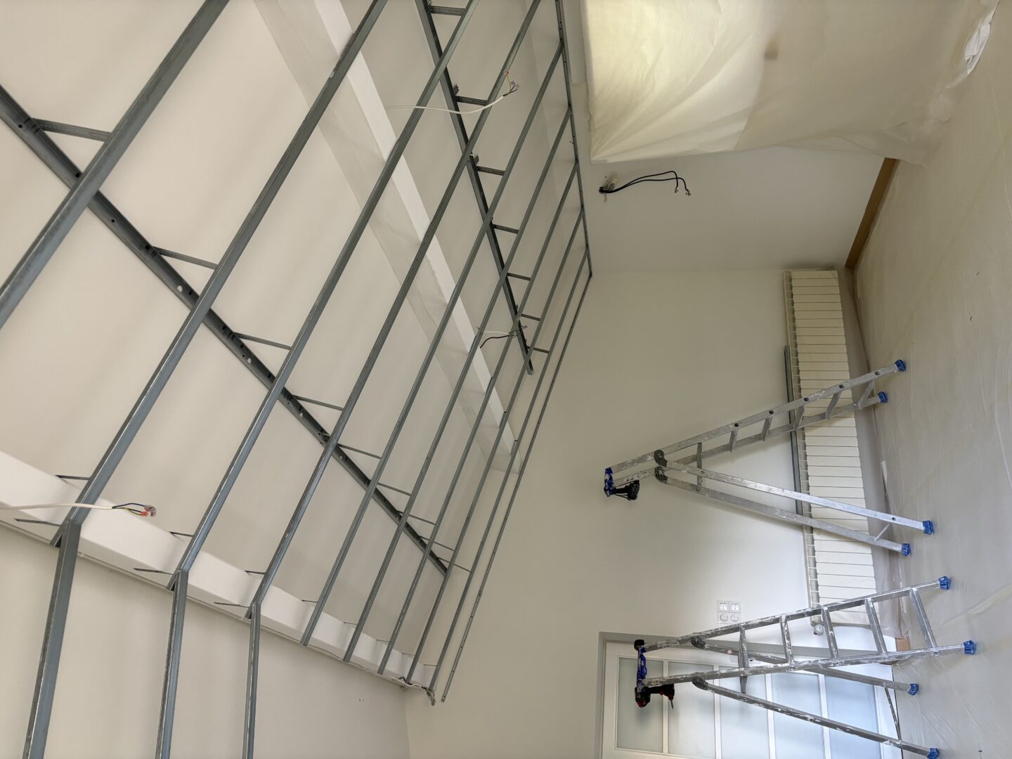 Après avoir combler d’éventuels trous et fissures des murs avec de la mousse expansive, une ossature métallique est créée sur-mesure et installée pour recevoir les plaques de plâtre. Les espaces entre les murs et les rails peuvent ensuite être remplis avec un isolant.