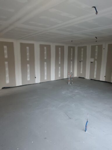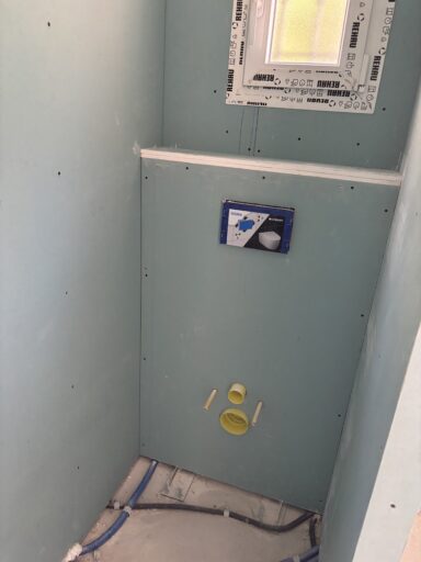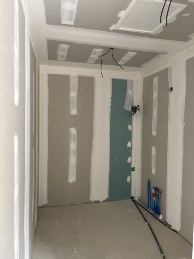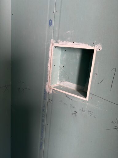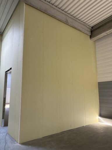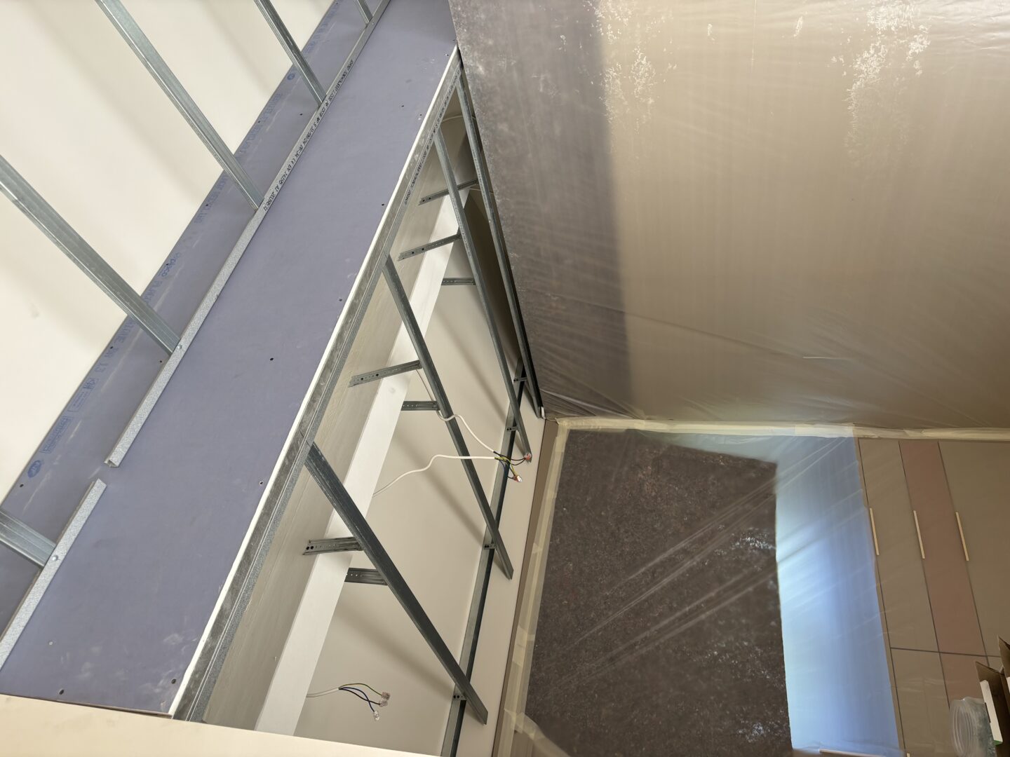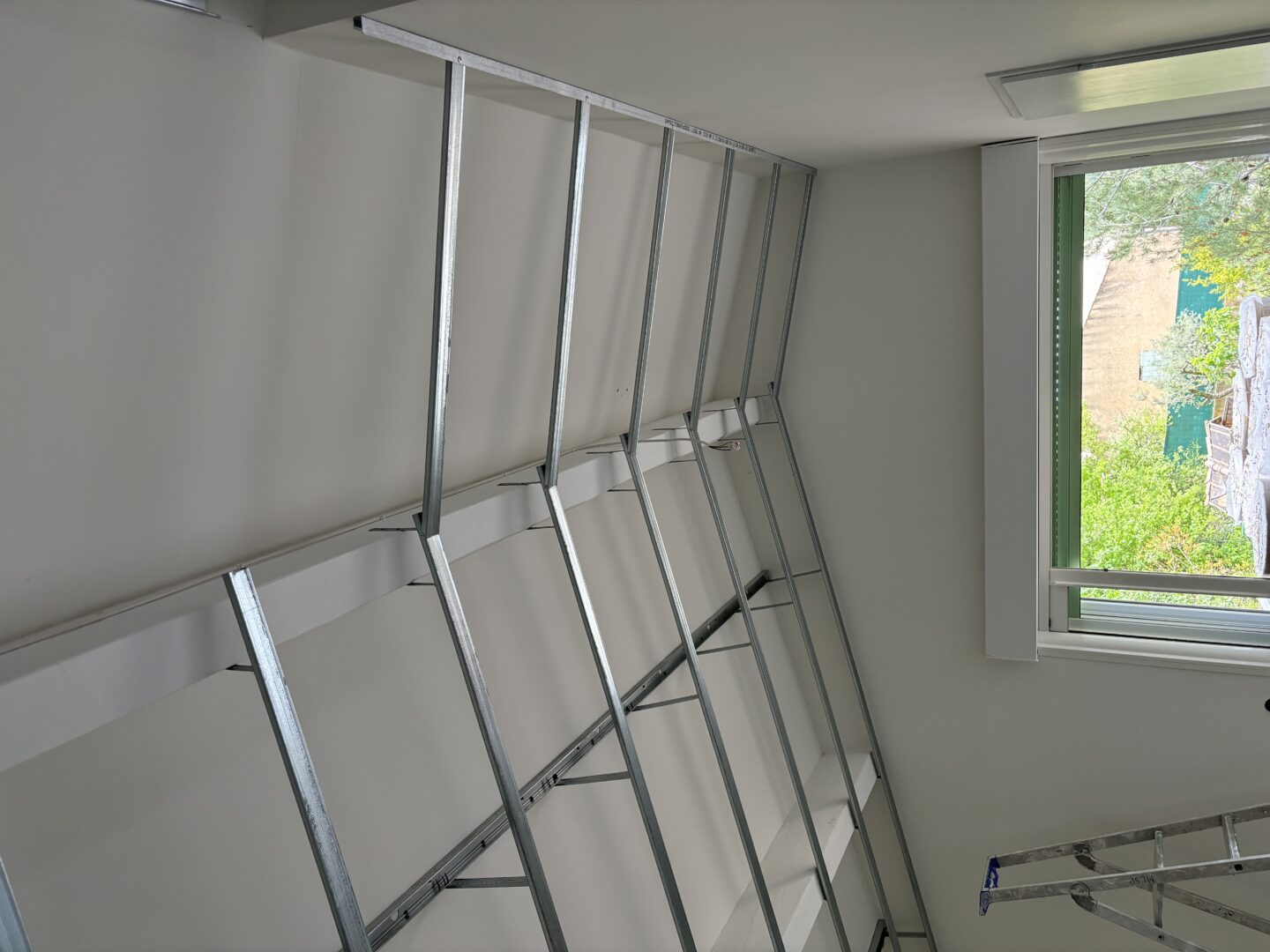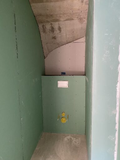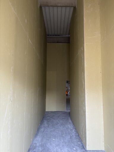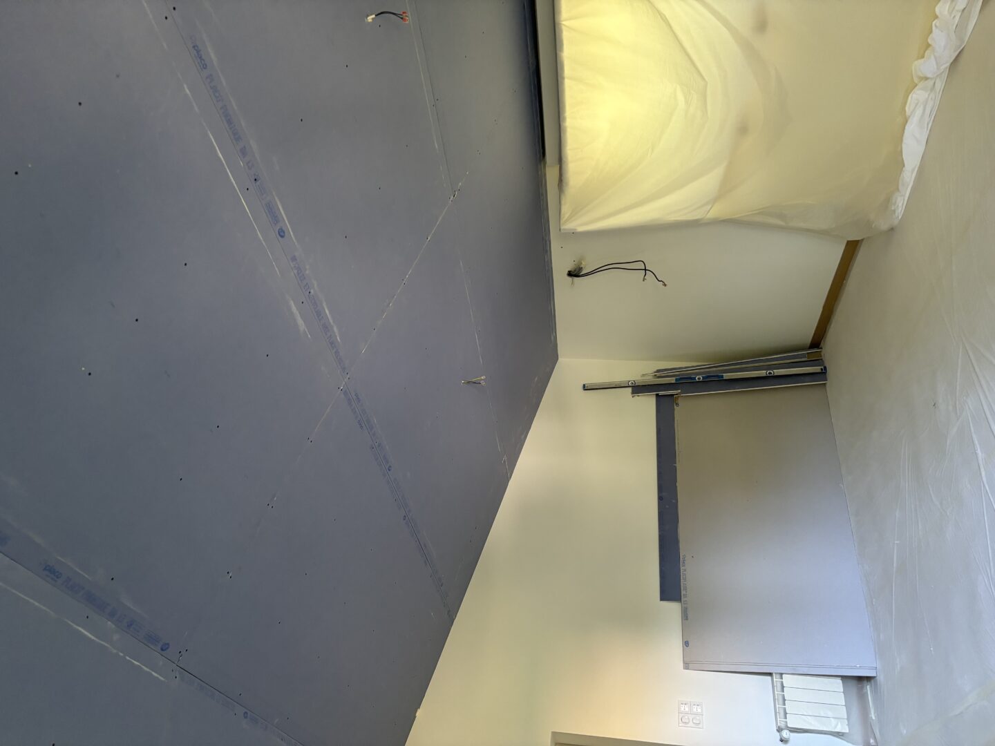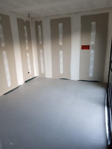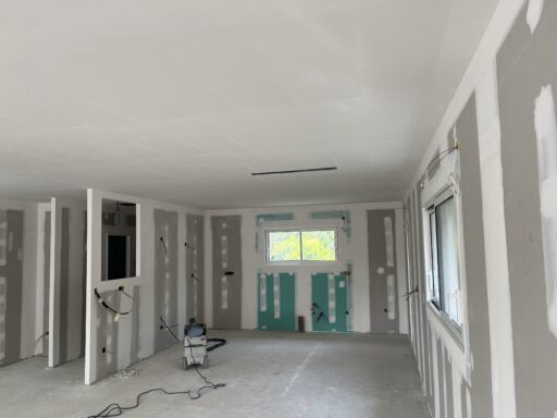Après avoir combler d’éventuels trous et fissures des murs avec de la mousse expansive, une ossature métallique est créée sur-mesure et installée pour recevoir les plaques de plâtre. Les espaces entre les murs et les rails peuvent ensuite être remplis avec un isolant.