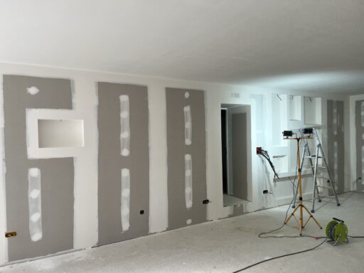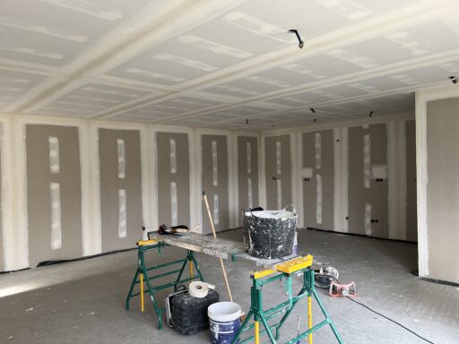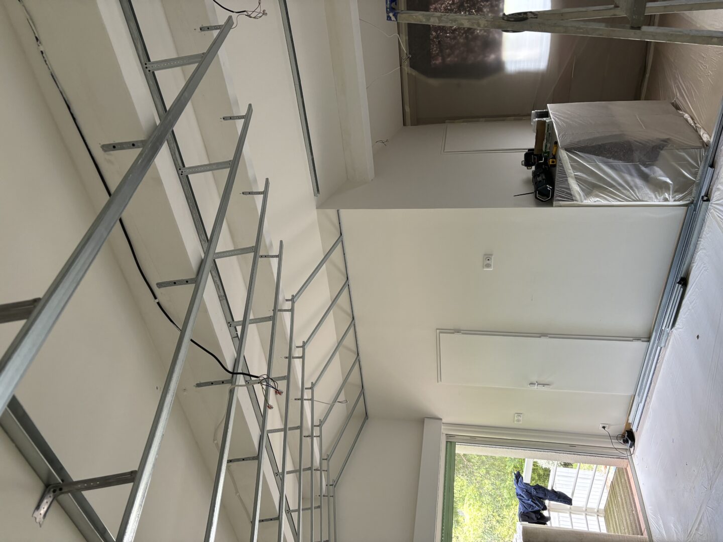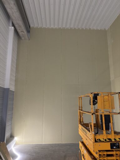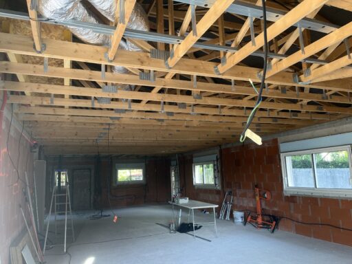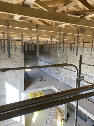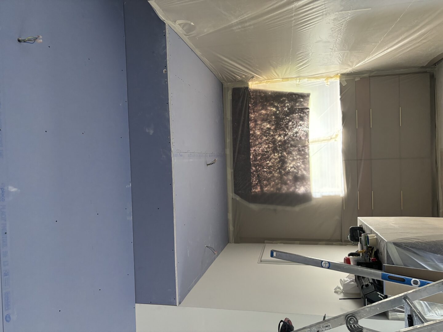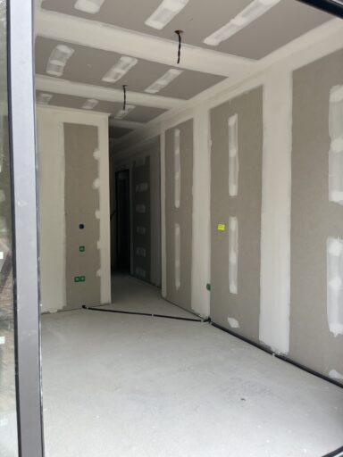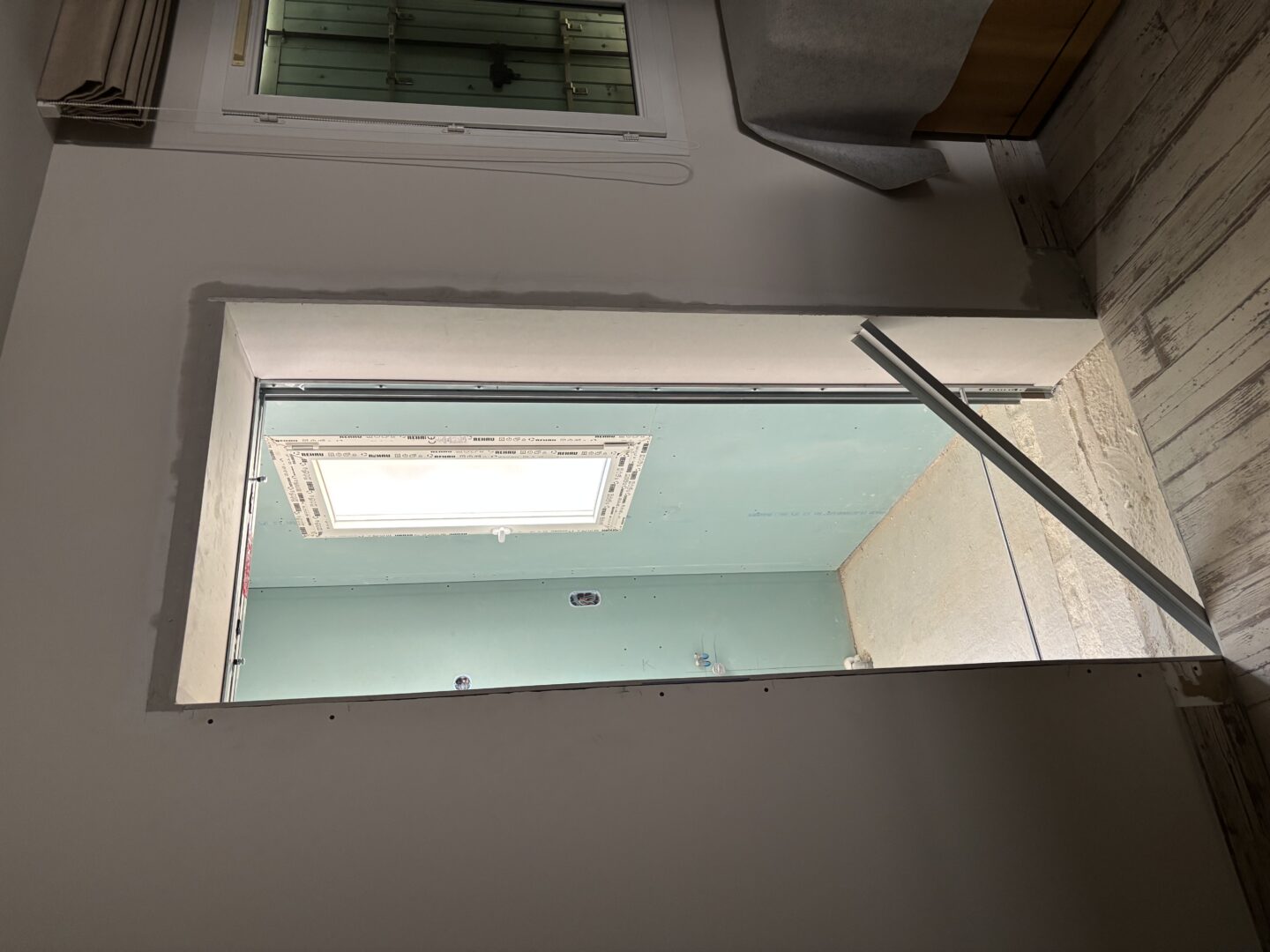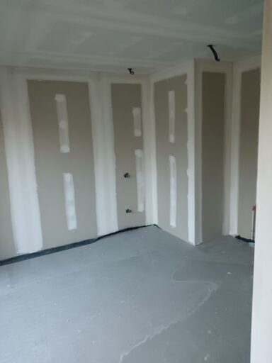 Après avoir combler d’éventuels trous et fissures des murs avec de la mousse expansive, une ossature métallique est créée sur-mesure et installée pour recevoir les plaques de plâtre. Les espaces entre les murs et les rails peuvent ensuite être remplis avec un isolant.