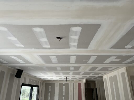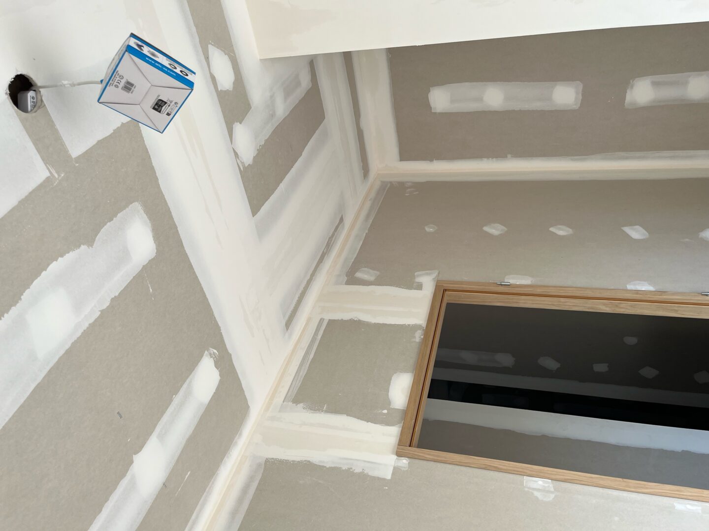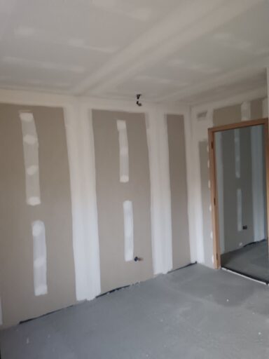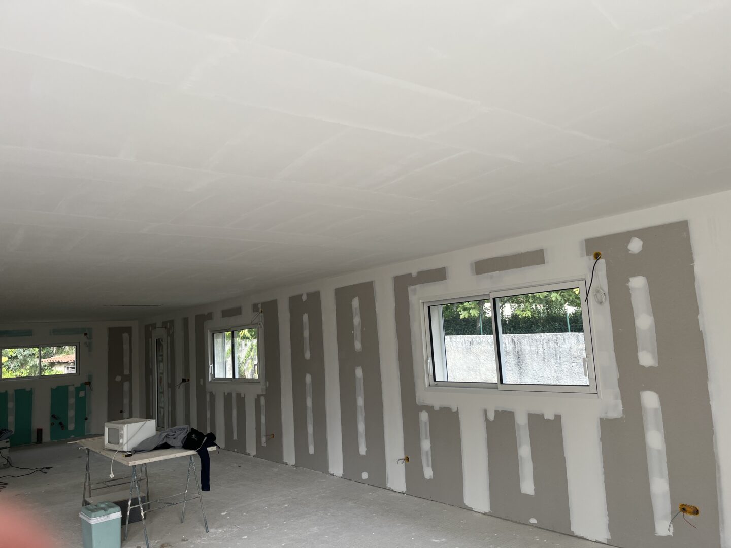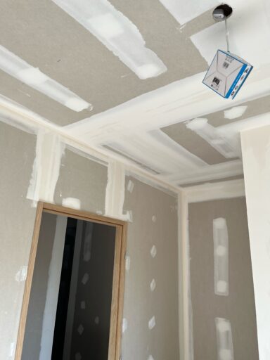 Les plaques de plâtre sont jointées entre elles par une couche d’enduit sur chaque bord. Une bande de papier sur l’enduit est ensuite appliqué, ainsi qu’une deuxième couche d’enduit pour fixer la bande de papier. Elles sont enfin poncées jusqu’à ce que les bords des plaques de plâtre soient lisses et uniformes avant d’être peintes.